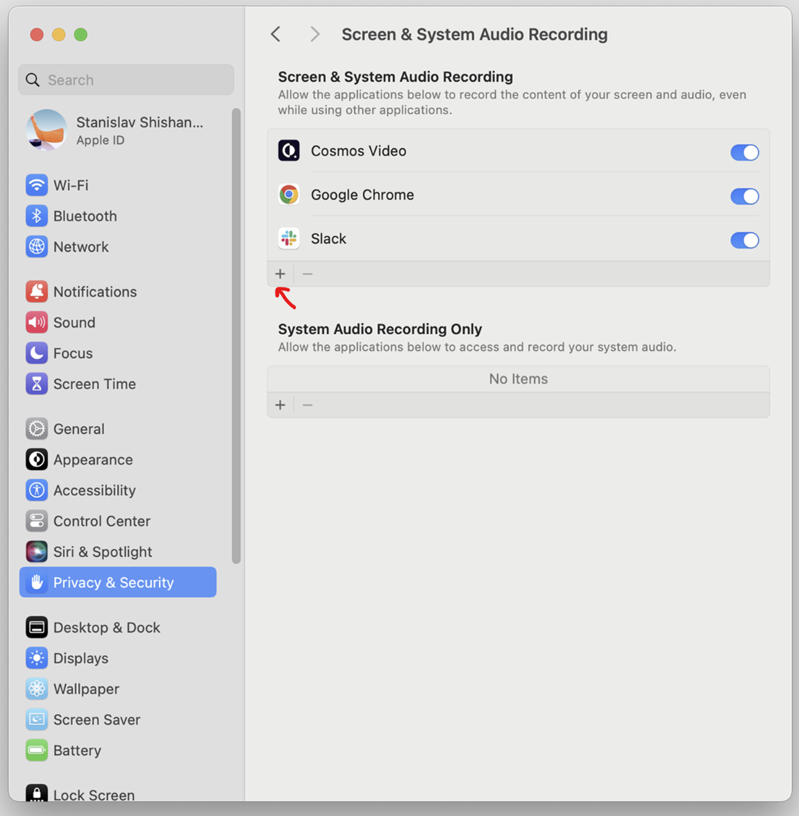 Note: If Cosmos doesn't appear in the "Screen & Audio Recording" list, click the "+" icon, navigate to Applications, and select Cosmos Video.