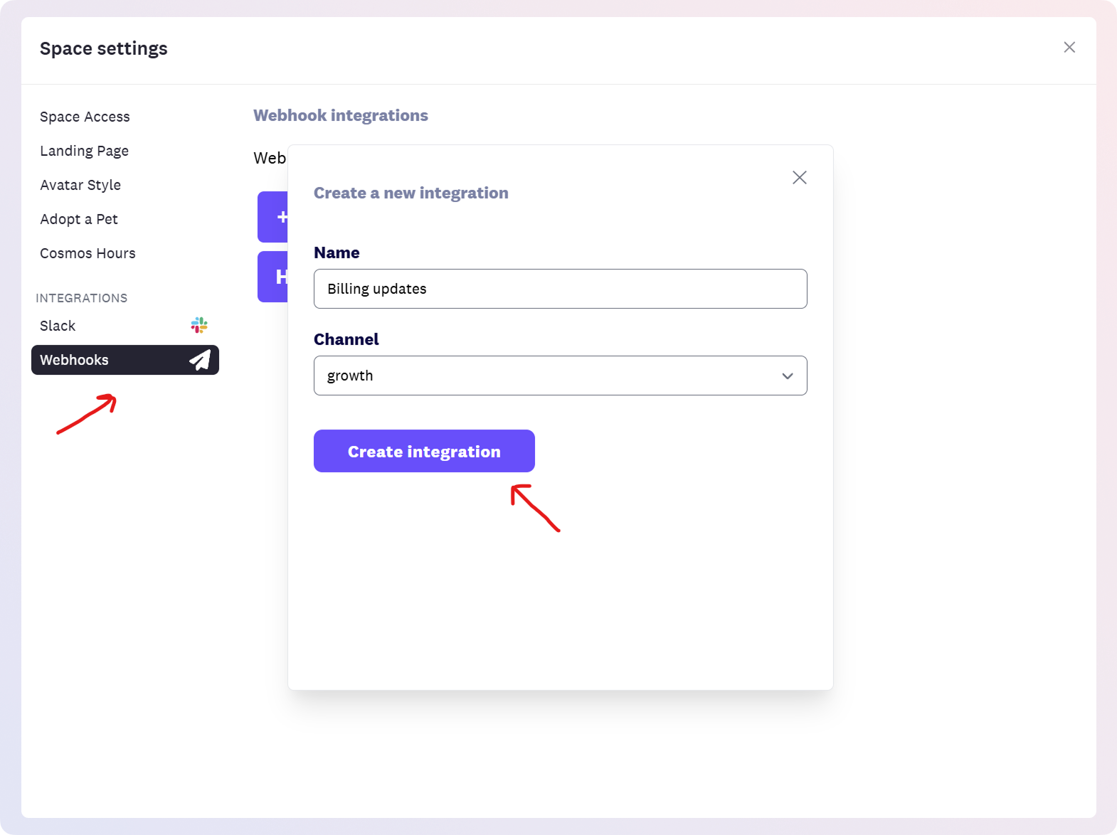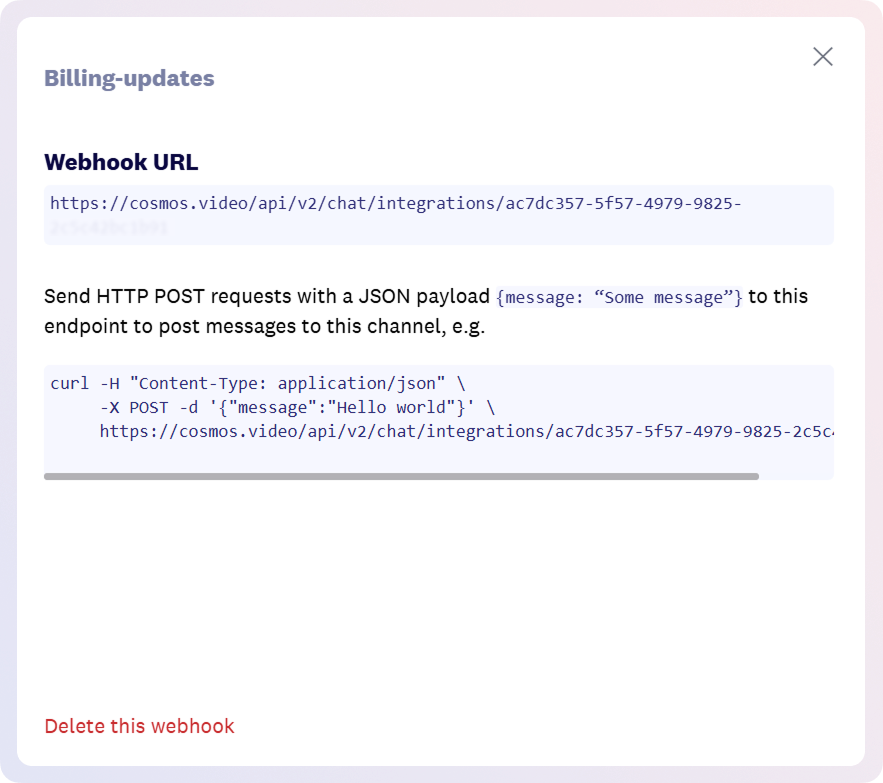 Webhooks let you post messages to your Cosmos chat channels via HTTP. Connect external services, automation tools, or custom applications to send notifications directly to your team.