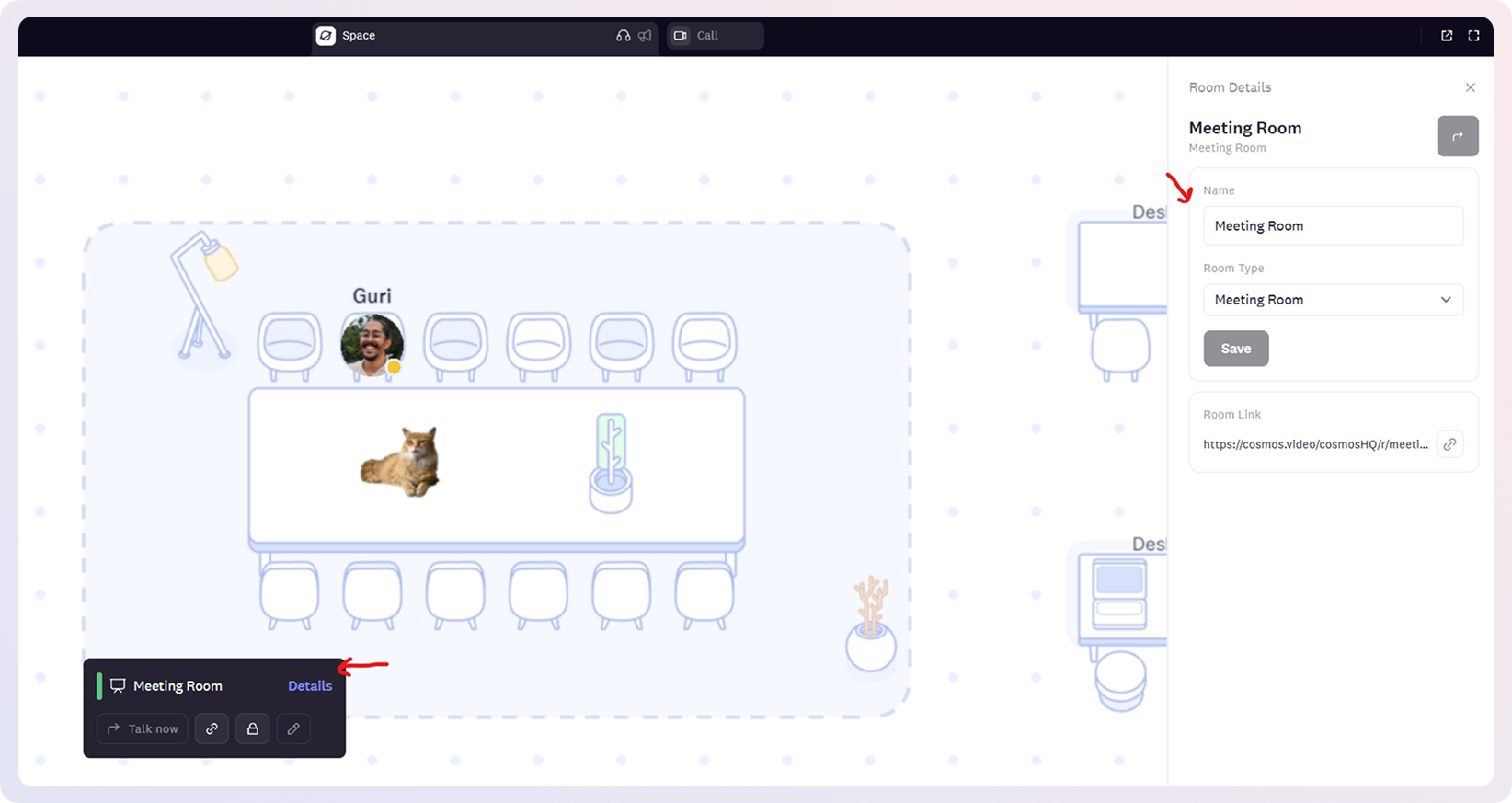 Meeting Rooms are like conference rooms or classrooms in a physical building—dedicated spaces for structured group conversations. The entire room functions as a single video call where everyone can see and hear each other, regardless of position. Think of it as your team's private conference room: similar to Google Meet or Zoom, but integrated into your Cosmos space. Perfect for planned meetings, presentations, and discussions where everyone needs to participate.