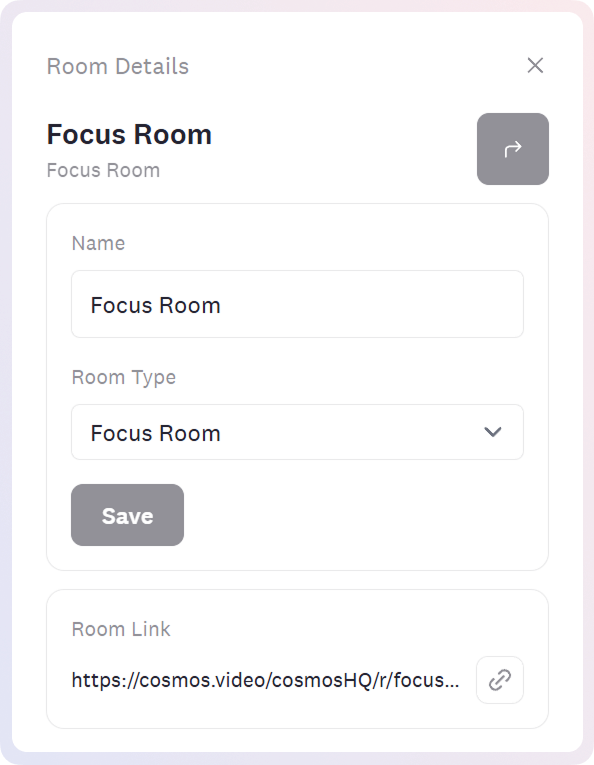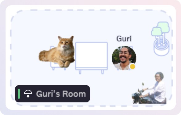 Personal Rooms are like having your own desk in Cosmos. You can claim a room as your home base, control who can join you with privacy settings (Open, Knock Required, or DND), and teammates can see if you're at your desk or away. Learn more about Personal Rooms here