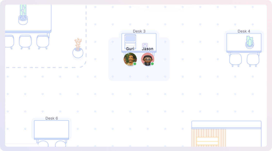 Spatial Areas are open spaces where proximity-based video calling works. People close to each other can see and hear one another, while those further away cannot. This creates natural conversation dynamics where moving closer to someone starts a conversation and stepping away politely ends the interaction. Learn more about Spatial Areas here