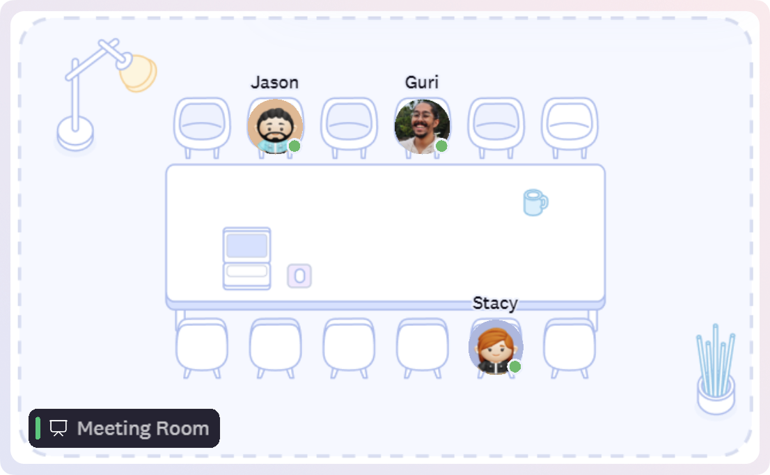 Meeting Rooms are like conference rooms where everyone can see and hear each other, regardless of position. The entire room functions as a single video call—similar to Google Meet or Zoom. Meeting Rooms include features like recording with AI transcriptions, breakouts, hand raise, and reactions. Learn more about Meeting Rooms here